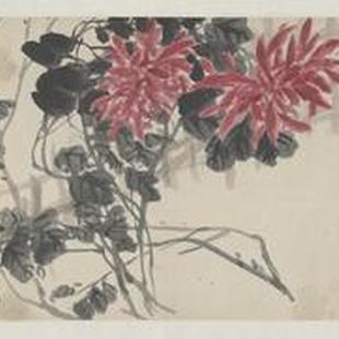 吴昌硕最擅长写意花卉,受徐渭和八大山人影响最大,由于他书法、篆刻功底深厚,他把书法、篆刻的行笔、运刀及章法、体势融入绘画,形成了富有金石味的独特画风。吴昌硕作画用“草篆书”以书法入画;线条功力异常深厚。虽然从状物绘形的角度看其线条的质感似乎不够丰富、切实,但恰恰是舍弃了形的羁绊,吴昌硕的绘画才步入了“意”的厅堂,从而形成了影响近现代中国画坛的直抒胸襟,酣畅淋漓的“大写意”表现形式。