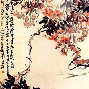 吴昌硕最擅长写意花卉,受徐渭和八大山人影响最大,由于他书法、篆刻功底深厚,他把书法、篆刻的行笔、运刀及章法、体势融入绘画,形成了富有金石味的独特画风。吴昌硕作画用“草篆书”以书法入画;线条功力异常深厚。虽然从状物绘形的角度看其线条的质感似乎不够丰富、切实,但恰恰是舍弃了形的羁绊,吴昌硕的绘画才步入了“意”的厅堂,从而形成了影响近现代中国画坛的直抒胸襟,酣畅淋漓的“大写意”表现形式。