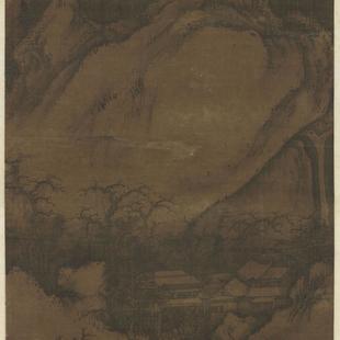 此图于夏季山野风景中穿插村落。立幅正中是峥嵘巍峨的巨峰,山势奇险,烟蔼浮现,其下为两山夹峙的峡谷,下部平坦处建有山庄及亭阁,山麓浅沙平岸有渔船停泊,山水中点缀乘轿的士大夫及朴野的渔夫山民,虽寥寥数笔,但人物神情动态跃然于绢素。此图虽无款识,但似卷云状的山石和壮健的笔墨正是郭熙本色,画中山峦林木郁郁葱葱,展现的是“夏山苍翠而如滴”的风貌。