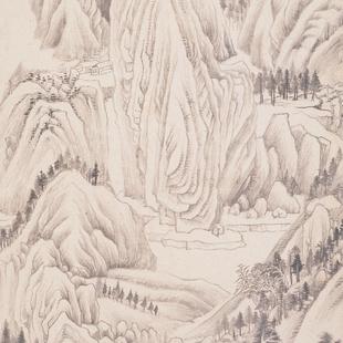 再如他暮年所作《关山雪霁图》,山峦林壑,绵延无际。右方重峦叠嶂,气势沉雄。中间幽壑重重,峭壁矗立,村落、丛林、流泉、山径,错落有致,杂而不乱;大江曲折跌宕其间,虽有干岩万壑,亦无窒碍不通的感觉。左方云烟弥漫,浸淫树石,路遥山重,隐人微茫,深远莫测,意味不尽。图中以渴笔钩勒峰峦山石,皴擦的运用极其准确、灵活,而线条流走轻快,疏密得宜。山冈陵石的凹凸明暗,则以横点巨苔,配上淡墨直皴的层层渲染来加以完成,技巧纯熟,无懈可击。意境朴厚深邃,很有“千山鸟飞绝,万径人踪灭”的诗意。