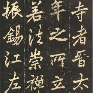 《麓山寺碑》又名《岳麓寺碑》,碑额有阳文篆书“麓山寺碑”四字,原石在长沙岳麓书院。今有宋拓本传世,此碑是最能体现李邕成熟的行书风格的代表作。古人有“右军如龙,北海如象”(明董其昌《跋李北梅缙云三帖》中语)的说法,这是唐代书法家中惟一一位让后人将其与书圣王羲之比肩并立的人物。所谓“北海如象”,大概就是指他的《麓山寺碑》这一类行书的风格特征。如果说《李思训碑》于豪爽雄健之气中尚透出一股风流潇洒之气;那么,《麓山寺碑》则可说是雄放苍老,稳健奇崛。这种风格的形成,得之于他对魏晋南北朝书法艺术的学习和理解,更在于他有大胆创新的精神。他将二王一派行书的灵秀与北碑的方正庄严巧妙地糅合起来,吸收南帖的灵活多变,而不取其柔弱的一面;除却魏碑的呆板,而保留其厚重的一面,在广泛接受前人成果的同时,或者是不自觉地将他自己的性情和人格外化到笔墨之中。董其昌以“北海如象”来比喻李邕书法的力度,亦可谓形象传神。