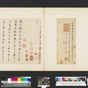 收传印:乾隆御览之宝,乾清宫鉴藏宝,乾隆鉴赏,石渠宝笈,三希堂精鉴玺,宜子孙,石渠定鉴,宝笈重编,嘉庆御览之宝,宣统鉴赏,无逸斋精鉴玺,诚思齐(重二),蘧庐,文征明印(重十二),衡山(重十三),文彭之印(重六),三桥居士(重三),文寿承氏(重六),神(重十八),品(重十八),得密(重九),寄敖(重六),墨林,墨(重十二),林(重十二),子京(重十四),项元汴印(重十),项元汴印,项元汴家珍藏(重二),子孙永保(重二),子孙世昌(重五),项叔子(重二),墨林子(重二),子京秘玩,项墨林鉴赏章(重五),项墨林鉴赏法书名画(重二),墨林山人子京项氏元汴珍玩书画之印(重七),香岩居士,平生真赏(重十),游方之外(重六),神游心赏(重五),虚朗斋(重四),墨林秘玩(重五),檇李项氏士家宝玩(重三),项翰墨印(重一),项墨林父秘笈之印(重七),宫保之家,从吾所好,天籁阁,墨林山人,西畴耕耦(重一),田畴耕耨(重一),沮溺之俦,若水轩(重二),惟心净土,项氏子京印,项氏子京,项子京家珍藏(重六),子京所藏(重一),子京珍藏,项元汴氏审定真迹(重四),攷古证今(重一),子綦父,子京父,桃里,项墨林印,元汴,会心处,易庵图书,胜国文献,御题图书府(重十六),翰墨林(重十二),仪周鉴赏(重十三),无恙(重十四),安氏仪周书画之章(重一),安岐之印,朝鲜人,黄琳美之(重五),休伯(重二),江表黄琳(重一),美之,黄琳印