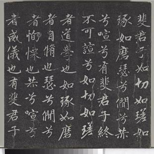 译文: 垂裕阁法帖。元赵孟𫖯书。(隶书)。大学。大学之道。在明明德。在新民。在止于至善。知止而后有定。定而后能静。静而后能安。安而后能虑。虑而后能得。物有本末。事有终始。知所先后。则近道矣。古之欲明明德于天下者。先治其国。欲治其国者。先齐其家。欲齐其家者。先修其身。欲修其身者。先正其心。欲正其心者。先诚其意。欲诚其意者。先致其知。致知在格物。物格而后知至。知至而后意诚。意诚而后心正。心正而后身修。身修而后家齐。家齐而后国治。国治而后天下平。自天子以至于庶人。壹是皆以修身为本。其本乱而末治者否矣。其所厚者薄。而其所薄者厚。未之有也。康诰曰。克明德。太甲曰。顾諟天之明命。帝典曰。克明峻德。皆自明也。汤之盘铭曰。苟日新。日日新。又日新。康诰曰。作新民。诗曰。周虽旧邦。其命惟新。是故君子无所不用其极。诗云。邦畿千里。惟民所止。诗云。缗蛮黄鸟。止于丘隅。子曰。于止。知其所止。可以人而不如鸟乎。诗云。穆穆文王。于缉熙敬止。为人君止于仁。为人臣止于敬。为人子止于孝。为人父止于慈。与国人交止于信。诗云。瞻彼淇澳。菉竹猗猗。有斐君子。如切如瑳。如琢如磨。瑟兮僩兮。赫兮喧兮。有斐君子。终不可諠兮。如切如瑳者。道学也。如琢如磨者。自修也。瑟兮僩兮者。恂栗也。赫兮喧兮者。威仪也。有斐君子。终不可諠兮者。道盛德至善。民之不能忘也。诗云。於戏前王不忘。君子贤其贤。而亲其亲。小人乐其乐而利其利。此以没世不忘也。子曰。听讼吾犹人也。必也使无讼乎。无情者不得尽其辞。大畏民志。此谓知本。此谓知本。此谓知之至也。所谓诚其意者。毋自欺也。如恶恶臭。如好好色。此之谓自谦。故君子必慎其独也。小人闲居为不善。无所不至。见君子而后厌然。揜其不善而著其善。人之视己。如见其肺肝然。则何益矣。此谓诚于中。形于外。故君子必慎其独也。曾子曰。十目所视。十手所指。其严乎。富润屋。德润身。心广体胖。故君子必诚其意。所谓修身在正其心者。身有所忿懥。则不得其正。有所恐惧。则不得其正。有所好乐。则不得其正。有所忧患。则不得其正。心不在焉。视而不见。听而不闻。食而不知其味。此谓修身在正其心。所谓齐其家在修其身者。人之其所亲爱而辟焉。之其所贱恶而辟焉。之其所畏敬而辟焉。之其所哀矜而辟焉。之其所敖惰而辟焉。故好而知其恶。恶而知其美者。天下鲜矣。故谚有之曰。人莫知其子之恶。莫知其苗之硕。此谓身不修。不可以齐其家。所谓治国必先齐其家者。其家不可教。而能教人者无之。故君子不出家而成教于国。孝者所以事君也。弟者所以事长也。慈者所以使众也。康诰曰。如保赤子。心诚求之。虽不中不远矣。未有学养子而后嫁者也。一家仁。一国兴仁。一家让。一国兴让。一人贪戾。一国作乱。其机如此。此谓一言偾事。一人定国。尧舜帅天下以仁。而民从之。桀纣帅天下以暴。而人从之。其所令反其所好。而民不从。是故君子有诸己。而后求诸人。无诸己。而后非诸人。所藏乎身不恕。而能喻诸人者。未之有也。故治国在齐其家。诗云。桃之夭夭。其叶蓁蓁。之子于归。宜其家人。宜其家人。而后可以教国人。诗云。宜兄宜弟。宜兄宜弟。而后可以教国人。诗云。其仪不忒。正是四国。其为父子兄弟足法。而后民法之也。此谓治国在齐其家。所谓平天下在治其国者。上老老而民兴孝。上长长而民兴弟。上恤孤而民不倍。是以君子有絜矩之道也。所恶于上。毋以使下。所恶于下。毋以事上。所恶于前。毋以先后。所恶于后。毋以从前。所恶于左。毋以交于右。所恶于右。毋以交于左。此之谓絜矩之道。诗云。乐只君子。民之父母。民之所好好之。民之所恶恶之。此之谓民之父母。诗云。节彼南山。维石岩岩。赫赫师尹。民具尔瞻。有国者不可以不慎。辟则为天下僇矣。诗云。殷之未丧师。克配上帝。仪监于殷。峻命不易。道得众则得国。失众则失国。是故君子先慎乎德。有德此有人。有人此有土。有土此有财。有财此有用。德者本也。财者末也。外本内末。争民施夺。是故财聚则民散。财散则民聚。是故言悖而出者。亦悖而入。货悖而入者。亦悖而出。康诰曰。惟命不于常。道善则得之。不善则失之矣。楚书曰。楚国无以为宝。惟善以为宝。舅犯曰。亡人无以为宝。仁亲以为宝。秦誓曰。若有一介臣。断断兮无他技。其心休休焉。其如有容焉。人之有技。若己有之。人之彦圣。其心好之。不啻若自其出口。寔能容之。以能保我子孙黎民。尚亦有利哉。人之有技。媢疾以恶之。人之彦圣而违之。俾不通。寔不能容。以不能保我子孙黎民。亦曰殆哉。唯仁人放流之。迸诸四夷。不与同中国。此谓唯仁人为能爱人。能恶人。见贤而不能举。举而不能先。命也。见不善而不能退。退而不能远。过也。好人之所恶。恶人之所好。是谓拂人之性。菑必逮夫身。是故君子有大道。必忠信以得之。骄泰以失之。生财有大道。生之者众。食之者寡。为之者疾。用之者舒。则财恒足矣。仁者以财发身。不仁者以身发财。未有上好仁。而下不好义者也。未有好义。其事不终者也。未有府库财。非其财者也。孟