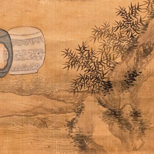 图绘盛夏时节,月下幽篁中,清水溪岸旁,一年纪稍长的仕女席地而坐,俯首弄琴。另一女子年纪稍小,调皮地趴在山石上,轻摇团扇,低头听琴。凉风轻拂,清音消暑,酷暑的燥热在夜色下悄然散去。
