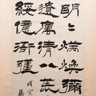 “杨隶”波划多作变形处理,往往一笔送出即收,不留波状,不强调波,而突出磔划,写得大脚露锋,如横划与捺划的磔笔。再则从“杨隶”用笔浑厚扎实,其撇捺在出锋的刹那,重顿而后尖即飞速出锋,留下隐绰枯涩的锋尾。其三,杨一生“研精隶书,于汉碑无所不窥”,用帖的笔法写碑,又不纯以汉碑的阳刚取胜。有化刚为柔,柔中见刚,弯曲柔韧,俨然不失雄强之势。