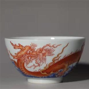 青花矾红海水龙纹大折底杯