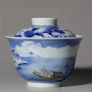 青花加彩雪景山水寒江独钓二才小盖碗
