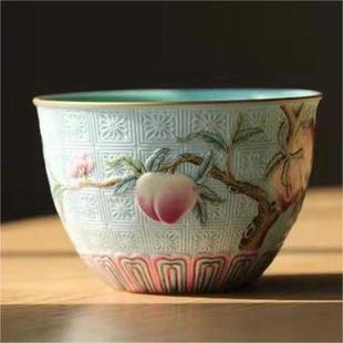 松石绿地雕刻粉彩桃子卧足缸杯 简介