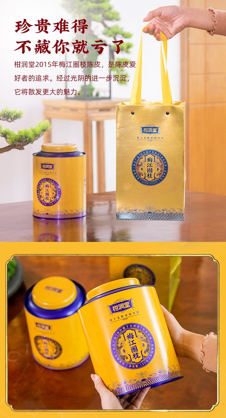柑润堂2015年梅江圈枝陈皮新会陈皮送礼广东特产铁罐礼袋装120g