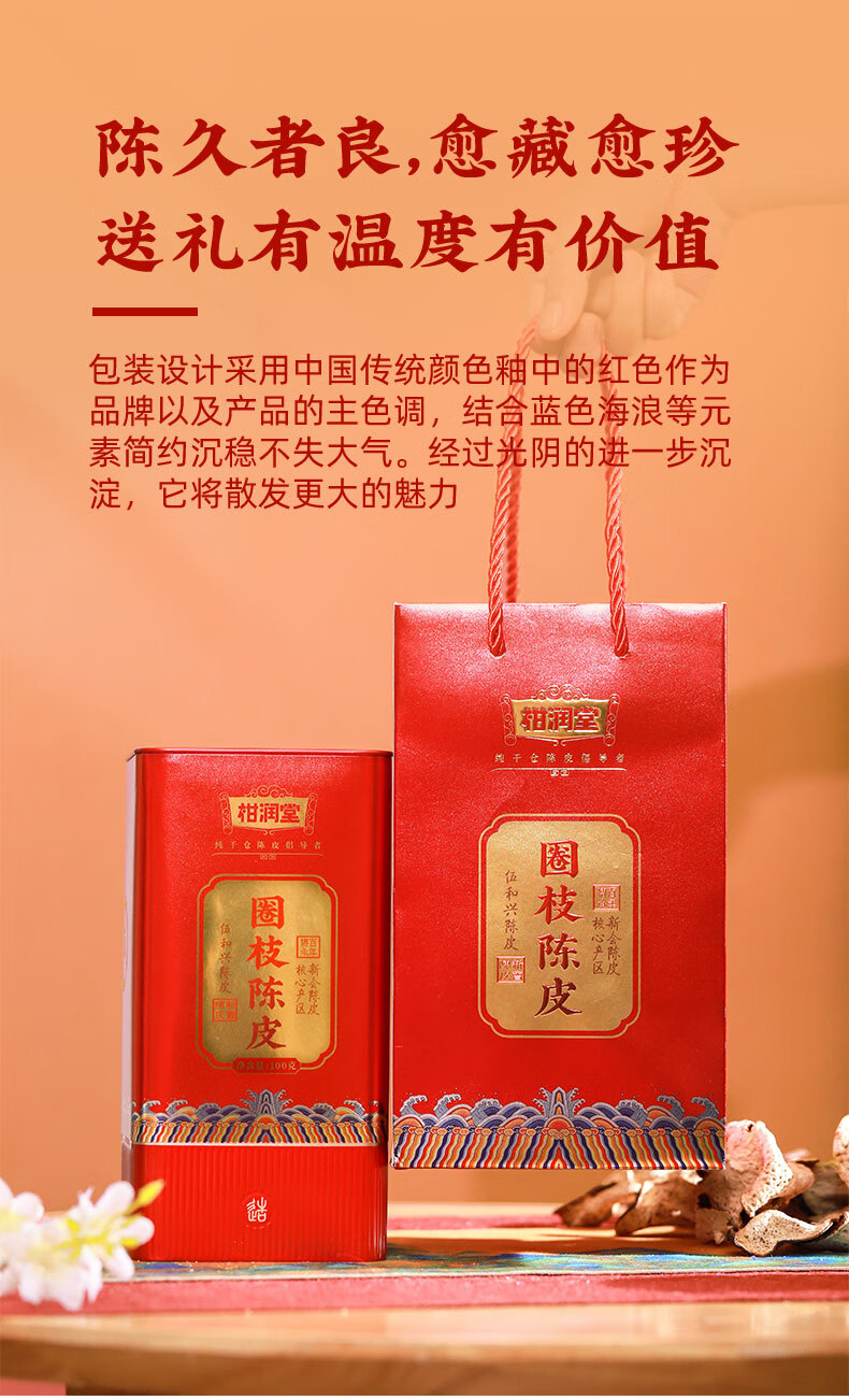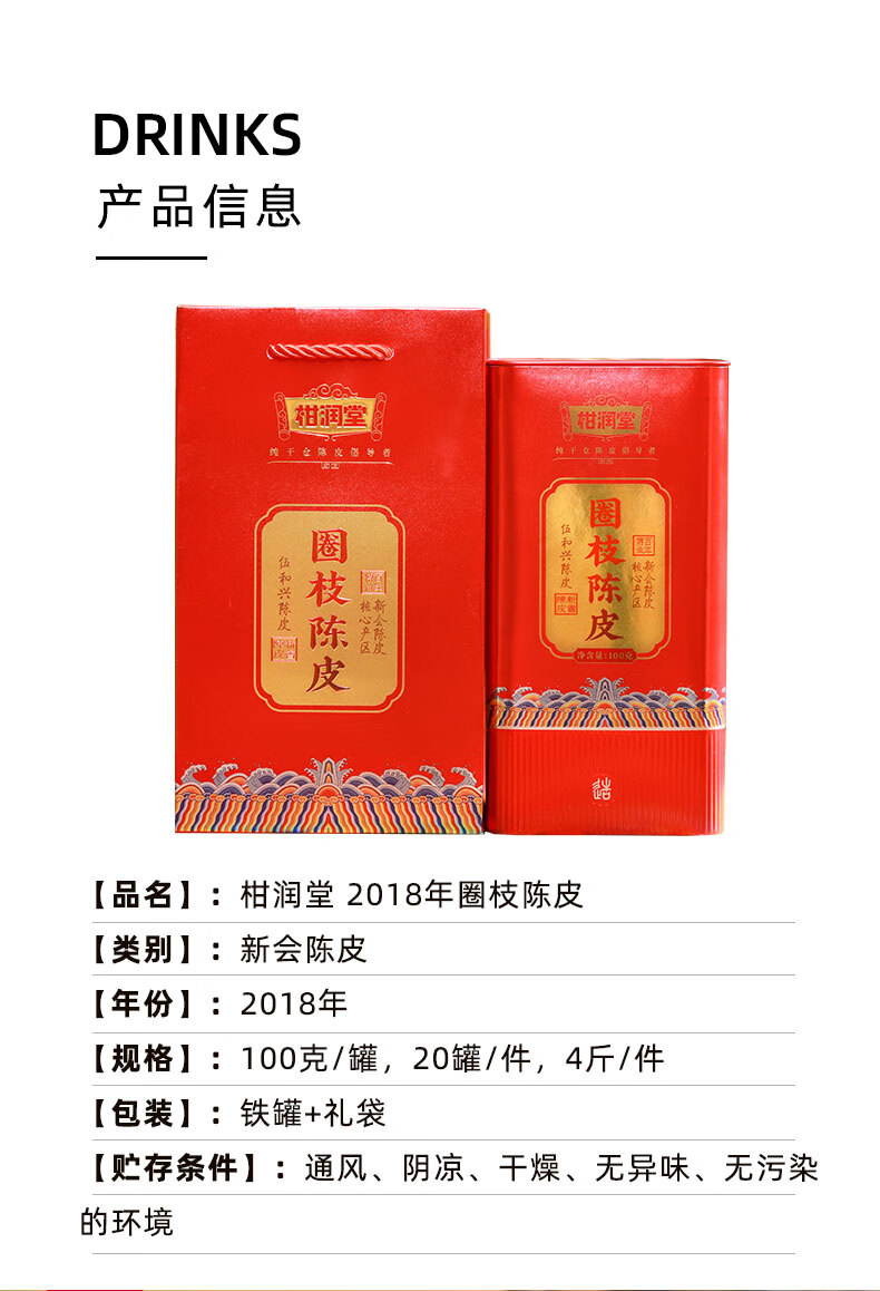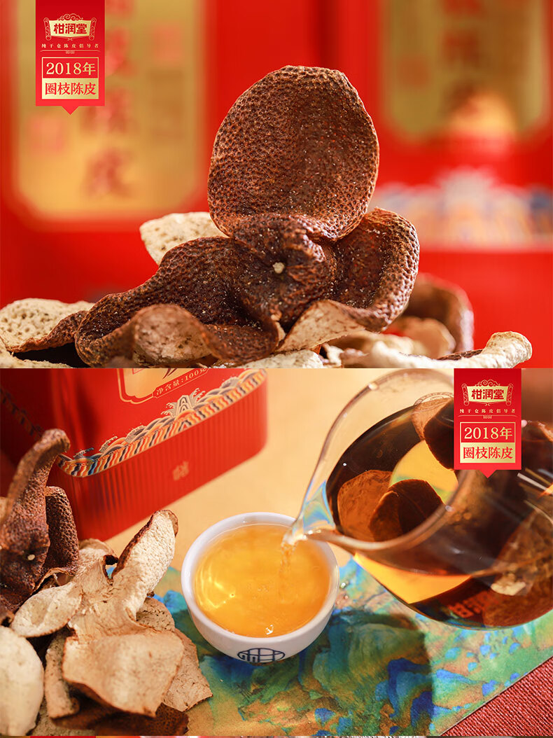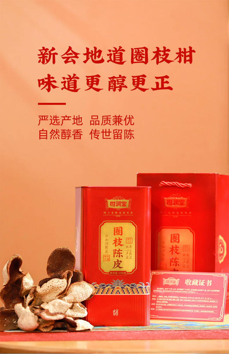柑润堂 2018年新会圈枝陈皮纯干仓陈放5年陈皮新会特产送礼罐装100克 简介