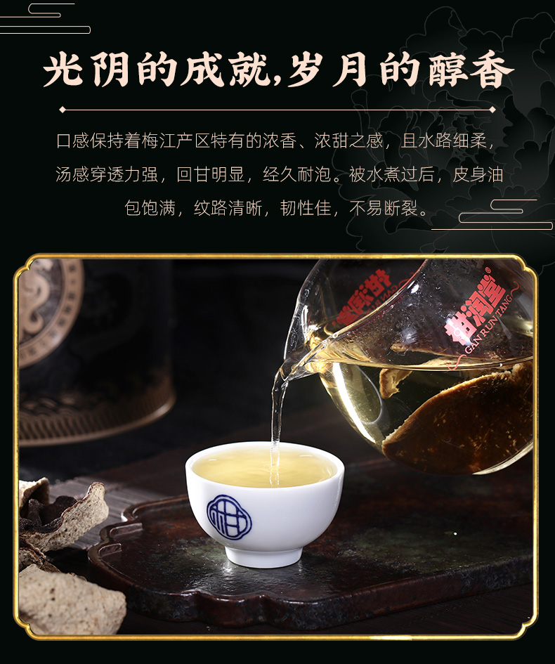 柑润堂茶业有限公司,定位于精品级别的柑普茶专业品牌,专注于健康产业市场,在新会拥有三家食品级工厂、签约超20家柑园、参股种植1120亩梅江庄园,具有柑茶产业链上游资源的完整战略布局,是一家工艺精湛、设备先进、管理科学,并坚持走品质化和品牌化发展路线的现代化生产企业。