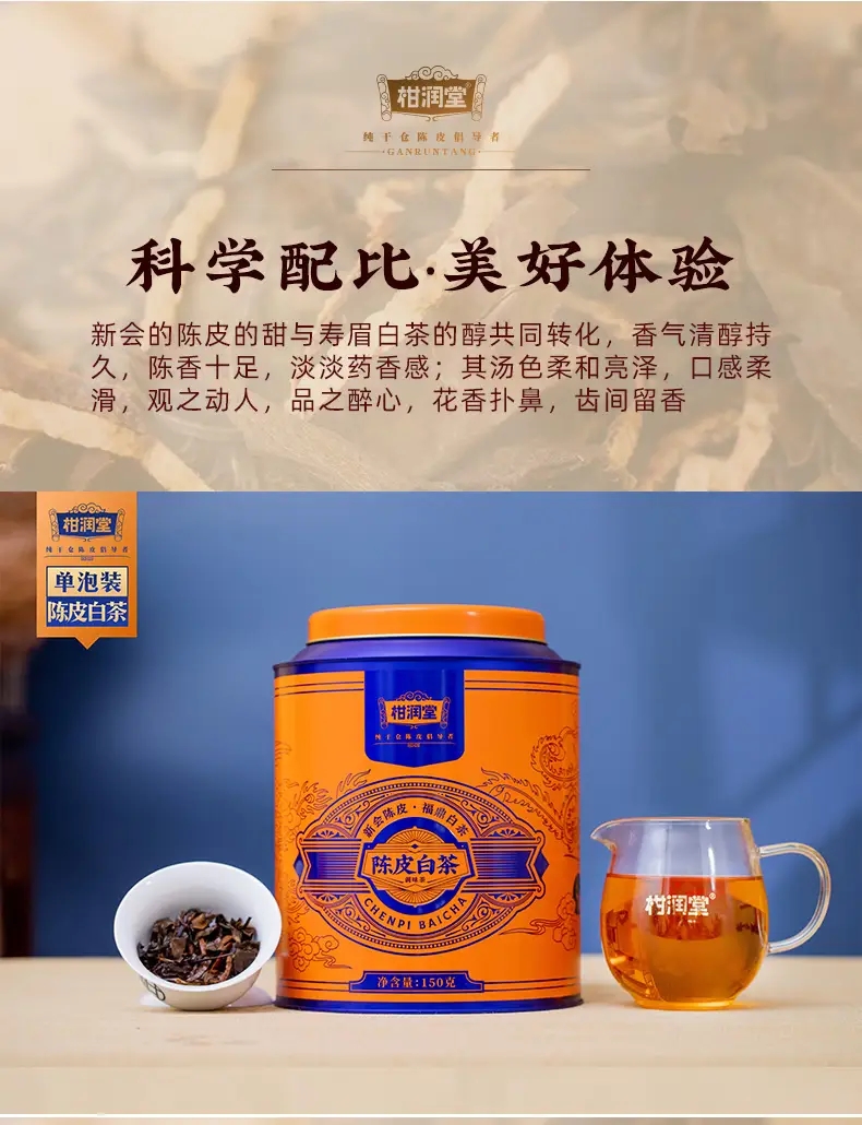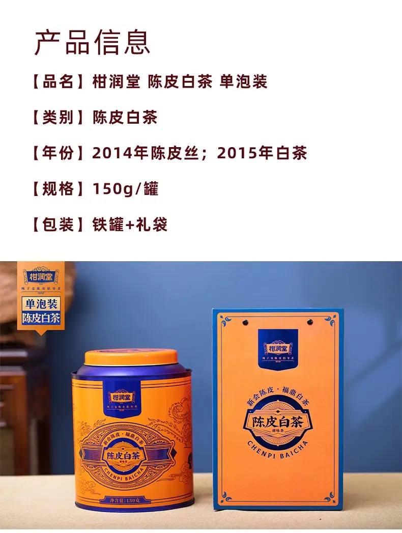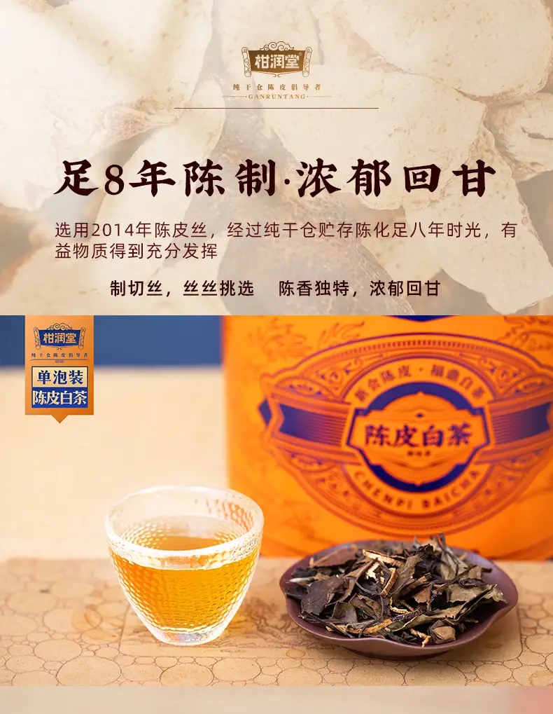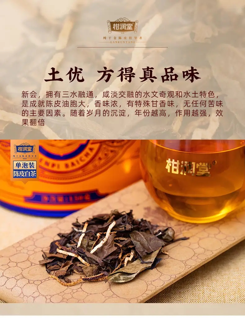 柑润堂 陈皮白茶单泡装2014年新会纯干仓陈皮丝搭配2015年白茶罐装150克 简介