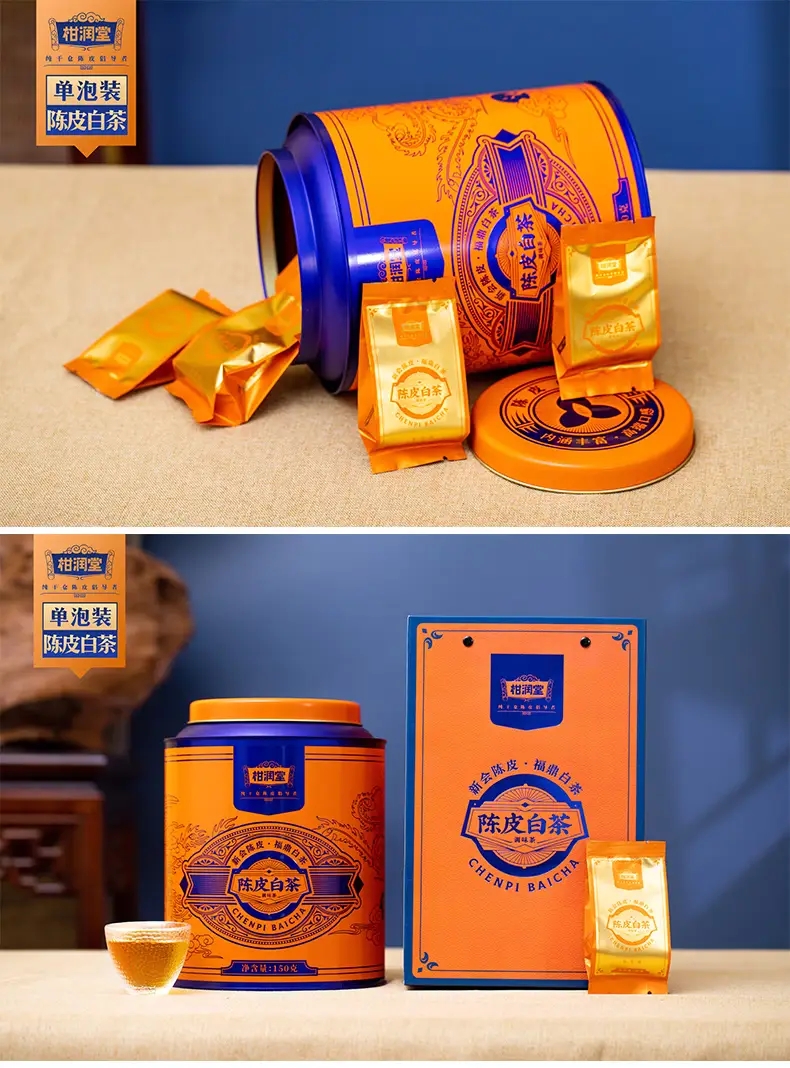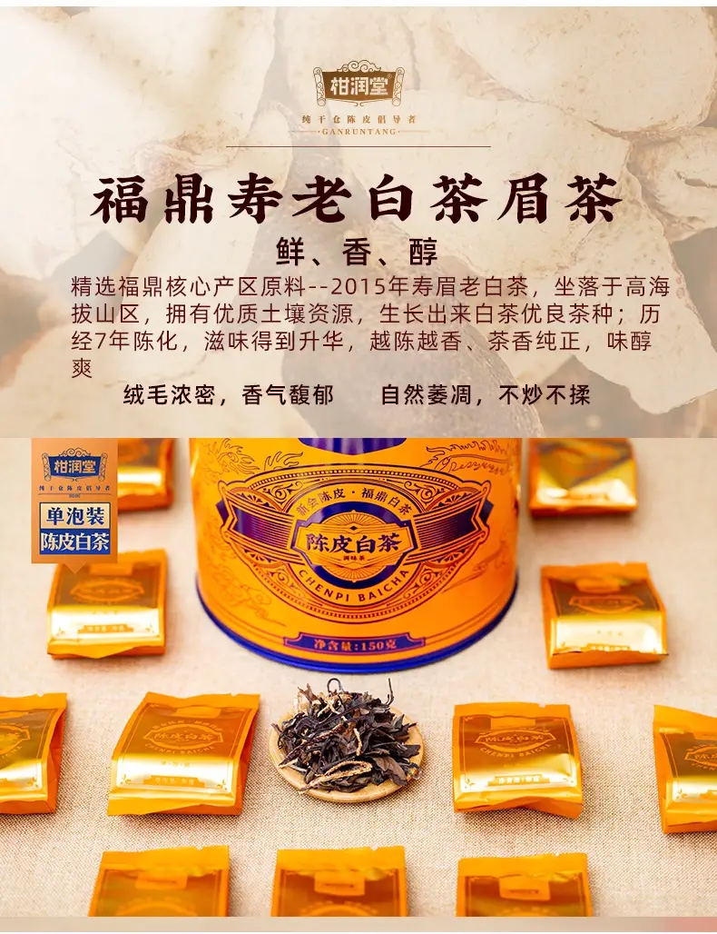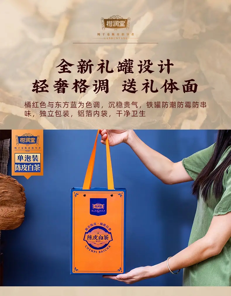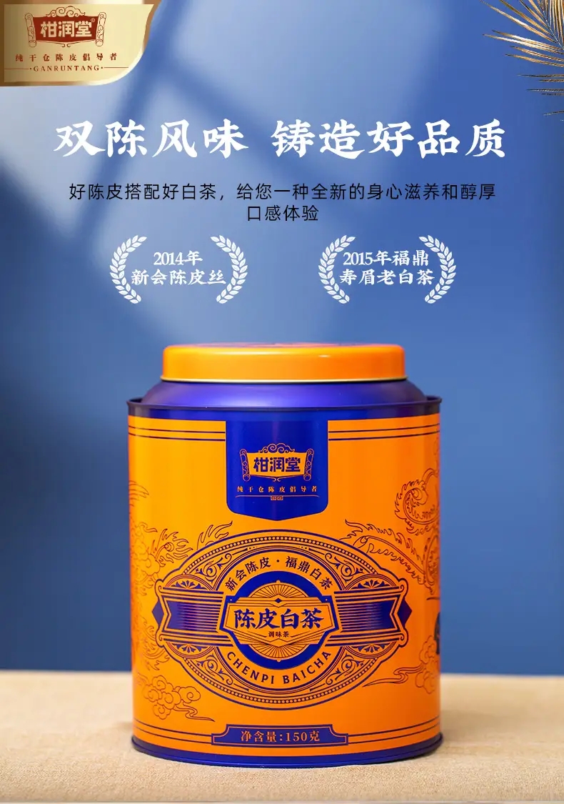柑润堂 陈皮白茶单泡装2014年新会纯干仓陈皮丝搭配2015年白茶罐装150克 简介