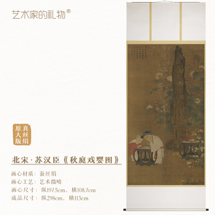 宋苏汉臣《秋庭戏婴图》原大挂轴真丝绢画芯手工精裱