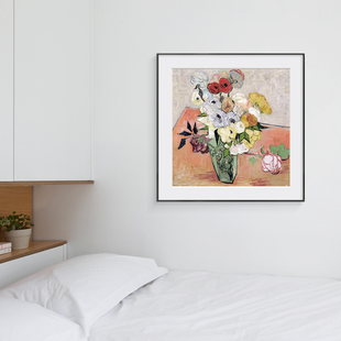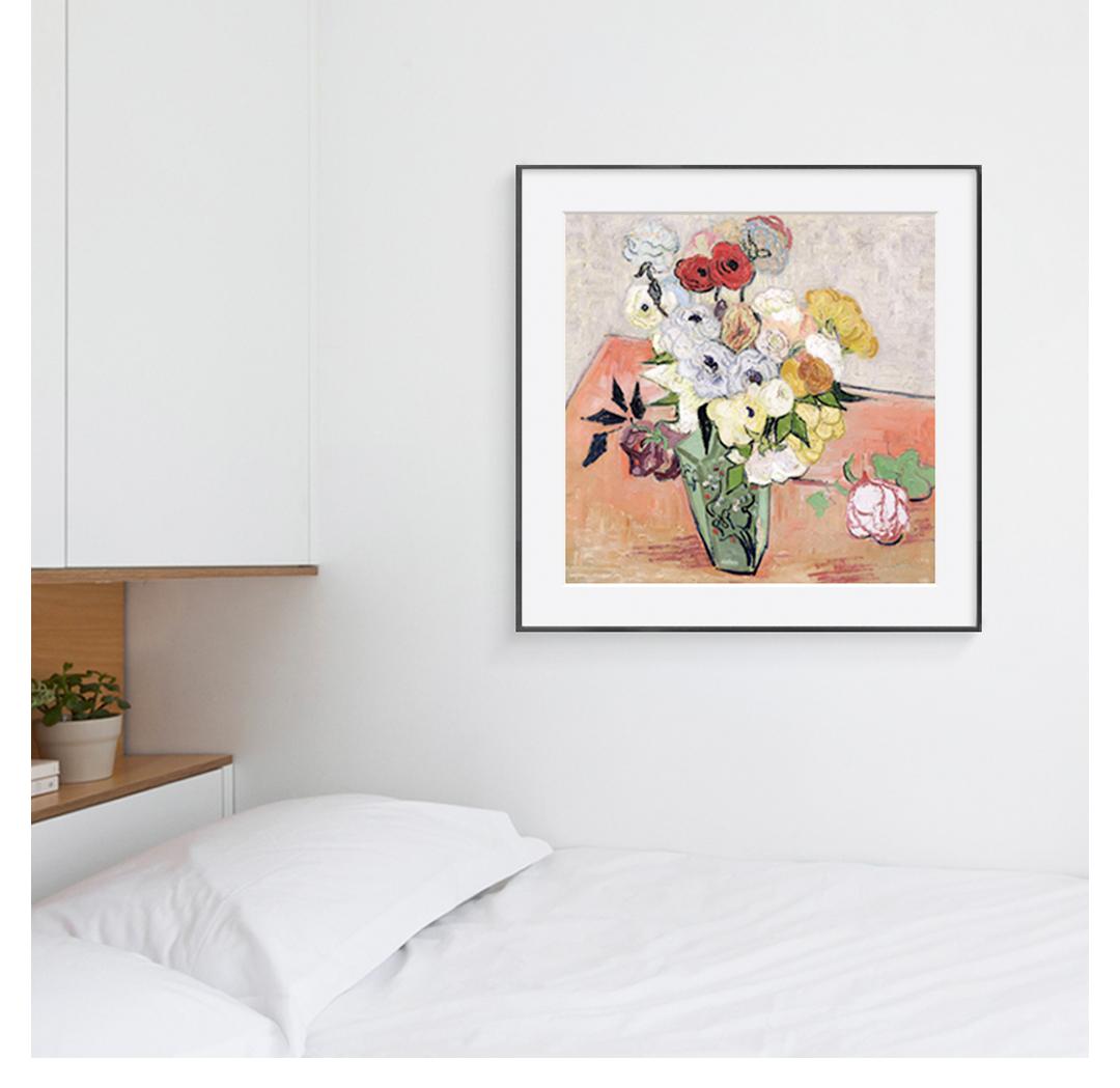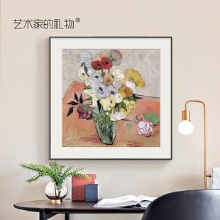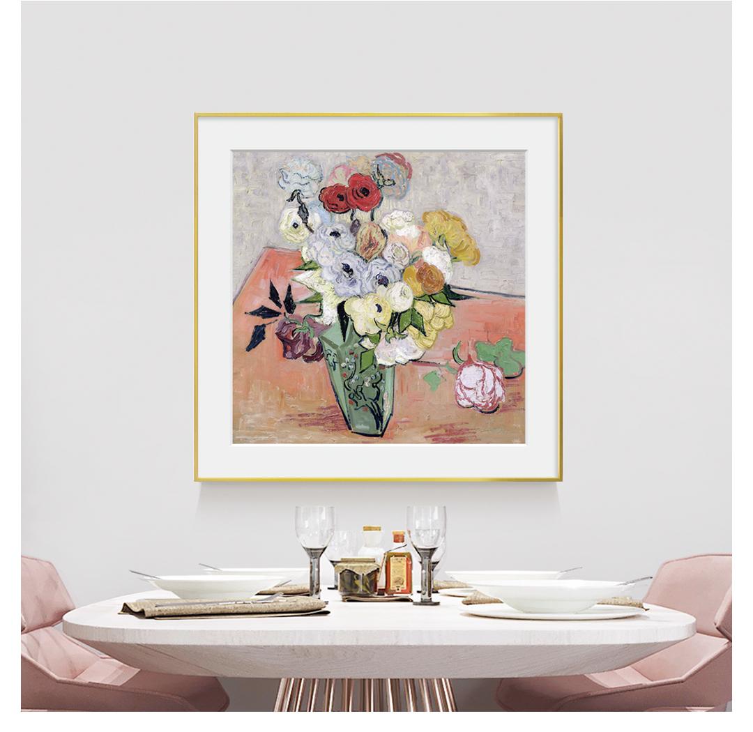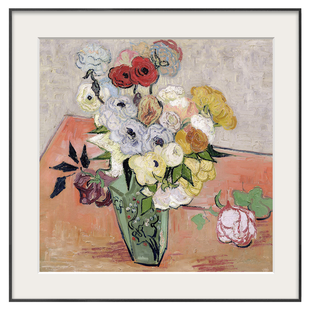 梵高-花瓶里的玫瑰与银莲花 博物馆级复刻版画 北欧客厅装饰油画