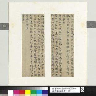 本册以小楷写北宋理学家周敦颐(一0一七-一0七三)所著《通书》,整体结字尚称整饬,风范从晋宋规矩中来,然略少韵味。书成于至元三年(一三三七)。本件第一开右下方写有千字文编号第三九五「志字号」等字,乃项元汴天籁阁旧藏。(台北故宫)