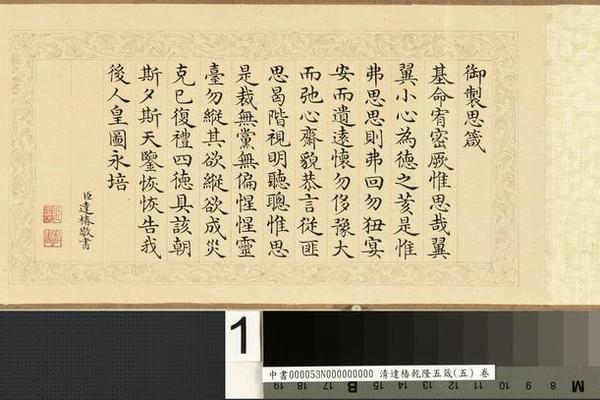 译文: 御制视箴。维目司视。其德曰明。明有由蔽。物引欲萌。伊古有训。五色目盲。勿眩锦绣。勤省农耕。勿玩珠玉。企望贤能。知人则哲。体察物情。曰视有要。视于无形。如水如鉴。万象自呈。静虚动烛。其本必清。垂旒端冕。储神致精。日月环照。无幽弗莹。克艰厥后。永正玉衡。臣达椿敬书。 (台北故宫)